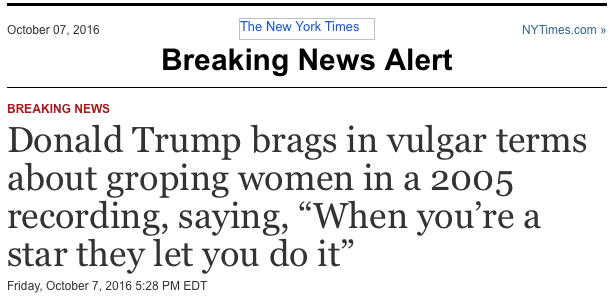 Meantime, I can't bear to even say "Goodbye, Donald Trump." I can't bear to wish him a good anything. He hurt people, including fourteen-year-old girls. An Irish curse be on him! And now let's rejoice at this wonderful "October surprise". The self-convicting boasting of Donald Trump!